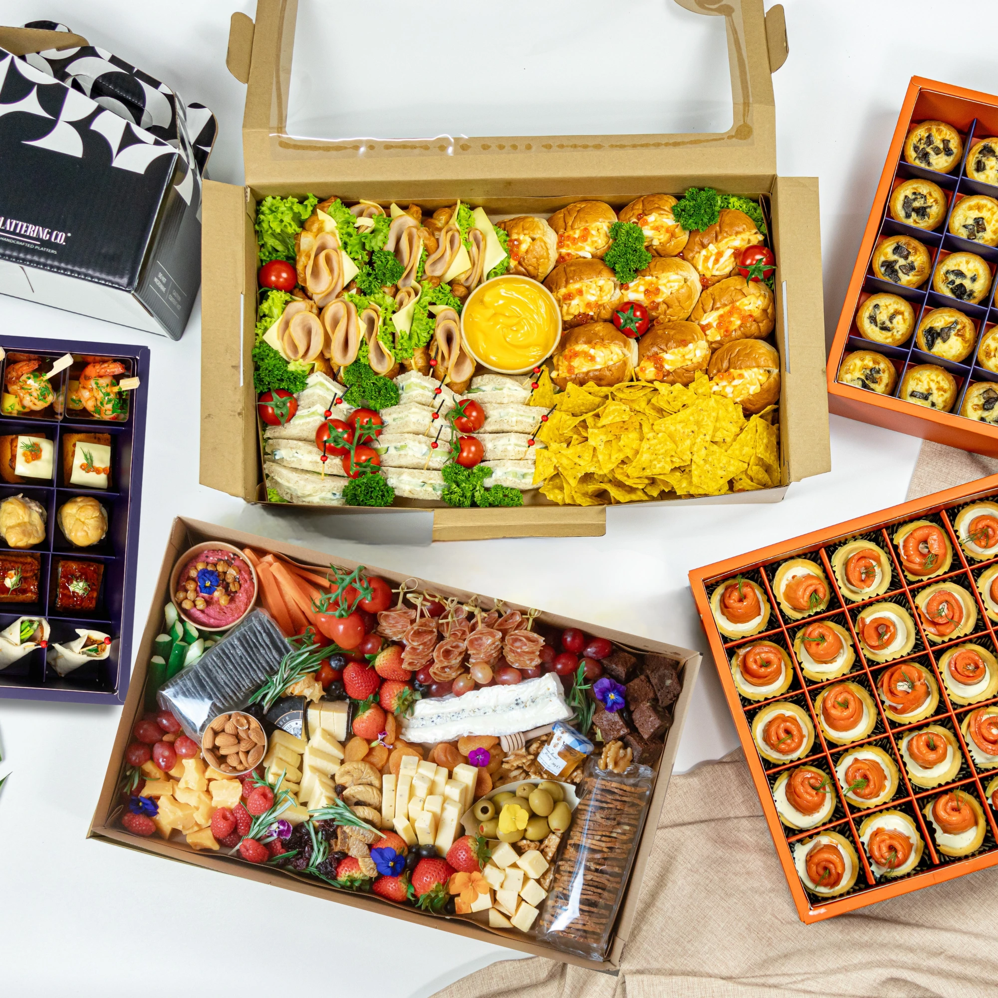 For when the guest list grows and expectations are high — The Grand Feast delivers a showstopping spread that’s both generous and effortless. This all-in-one bundle is packed with variety, featuring hearty sandwiches, three styles of elegant canapés, a gourmet cheese platter for grazing, and a refreshing pour-over drink set to round things off.